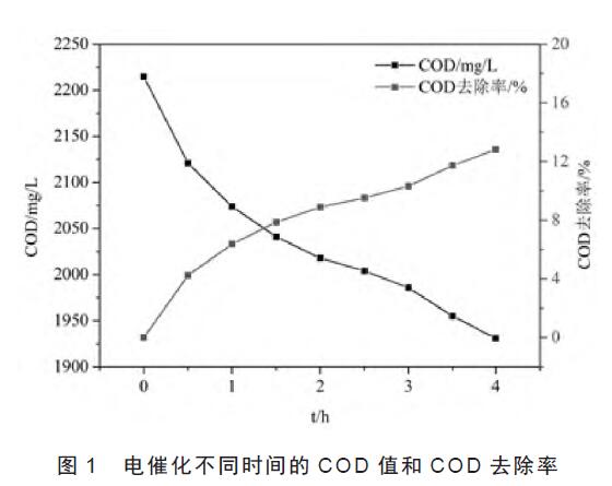 利用電催化處理該印染廢水,其結(jié)果見(jiàn)圖1。從圖1 中可以看出,隨著電解時(shí)間的延長(zhǎng),COD 值逐漸減小,但是COD 的去除率不大,到第4 h 時(shí),COD 的去除率為12.82%,對(duì)應(yīng)的COD 值為1 931mg/L,表明電催化法去除該印染廢水中的COD 效果不佳,分析原因可能是該廢水的pH 為強(qiáng)堿性,不利于電催化產(chǎn)生強(qiáng)氧化性的•OH。