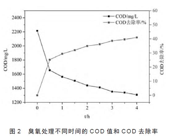 利用臭氧氧化技術(shù)處理該印染廢水,其結(jié)果見(jiàn)圖2。從圖2 中可以看出,隨著氧化時(shí)間的延長(zhǎng),COD 值逐漸減小。第1 h 時(shí),COD 的去除率達(dá)到29.43%,到第4 h 時(shí),COD 的去除率為40.98%,對(duì)應(yīng)的COD 值為1 308 mg/L,表明臭氧氧化法該印染廢水中的COD 的去除具有一定的效果,分析原因是堿性條件下,臭氧分解快,羥基自由基氧化作用大,COD 的去除率增加。