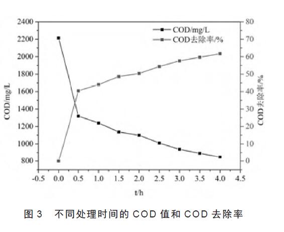 3 電催化臭氧氧化協(xié)同處理印染廢水利用二維電催化+ 臭氧協(xié)同作用處理該印染廢水,在處理過(guò)程中pH 逐漸降低,但降低幅度較小。隨著反應(yīng)時(shí)間的增加,COD 值逐漸降低。在1.0 h 時(shí),COD 值降低幅度 很大,由2 215 mg/L 降到1 240 mg/L,去除率為44.02%,反應(yīng)延長(zhǎng)至4 h 時(shí),COD 值降低至847 mg/L,對(duì)應(yīng)的去除率為61.76%。結(jié)果表明電催化+ 臭氧協(xié)同處理技術(shù)對(duì)COD 的去除效果較好,分析原因可能是電催化進(jìn)行電解時(shí),在極板之間產(chǎn)生大量的細(xì)小氣泡,增大臭氧氣體的接觸面積,促使臭氧大量進(jìn)入液相或者在氣液界面反應(yīng),提高了臭氧的利用效率。