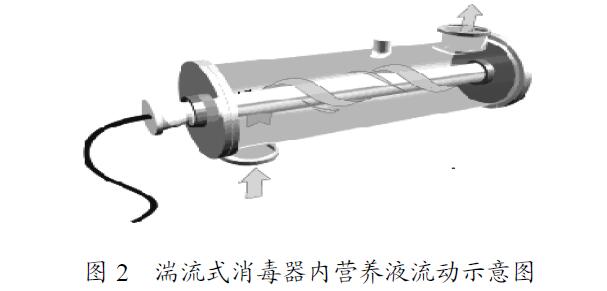 針對上述問題,自行設計了一種新型的紫外線消毒器[17]:在消毒腔體內安裝螺旋形導流片,使營養液以湍流形式流動(圖2),即讓沿不銹鋼腔體內壁流動的營養液也有一部分時間是在石英套管附近流動。營養液在距離紫外燈管較近或較遠的兩個區域停留的時間接近,從而解決了因一部分營養液滅菌不徹底而影響整體滅菌效果的問題。