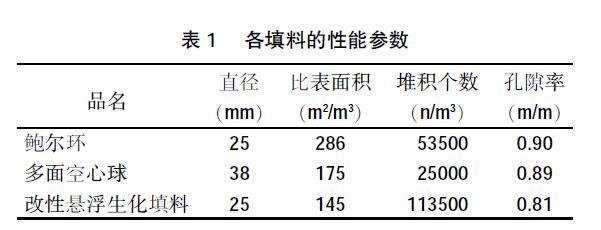 試驗用水是溫度為20℃的自來水,純氧作為氣源,填料分別為多面空心球、鮑爾環和改性懸浮生化填料。