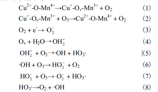 Cu 摻雜會增加比表面積,改變化學鍵,并促進多價金屬的轉化和氧空位的產生[12].加入Ce 后,催化劑中的小半徑的Cu-Mn 取代了CeO2 中的大半徑的Ce,進入到CeO2晶格中,從而產生很多的表面空位,形成缺陷結構,加快了供氧速度,從而提高了催化劑活性,促進對O3的轉化率[13–14].Mn 與Cu 的氧化物復配會產生錳銅固溶體,從而導致晶格氧的缺陷,有效地改善了催化劑吸附和活化氧的能力,并且通過兩者的復配形成的銅錳尖晶石將進一步提高催化劑的活性,原理見式(1)—(8).