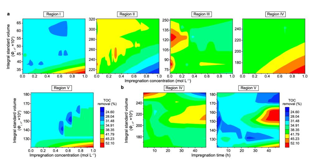 熒光光譜初步限定了催化劑的配方參數的范圍(圖4)。例如,當廢水中的有機物以色氨酸類和類溶解性代謝產物為主時,Mn(NO3)2的浸漬濃度和時間分別小于0.3 mol L−1和10 h。此外,該模型得到的Mn/γ-Al2O3很佳配方為:0.155 mol L−1 Mn(NO3)2溶液中浸漬8.5 h, 600°C焙燒3.5 h。模型預測值和實驗值分別為54.48%和53.96%。很后,•OH和1O2的協同氧化作用提高了Mn/γ-Al2O3催化劑的催化性能。