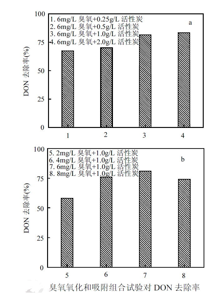 3.在臭氧氧化和活性炭吸附組合試驗中,DON 的去除率 很大可達 83.3%;臭氧投加量固定(6.0mg/L),隨活性炭投加量增加(從0.25g/L增加到2.0g/L),協同因子從1.15到1.09,表明此時臭氧/活性炭體系中存在著明顯的協同效應;當活性炭投加量固定(1.0g/L),臭氧投加量為2,4,6mg/L,協同因子分別為1.12、1.07 和1.10,臭氧/活性炭體系中也存在著一定程度的協同效應,臭氧投加量為8mg/L時,協同因子為0.97,系統無明顯協同作用.
