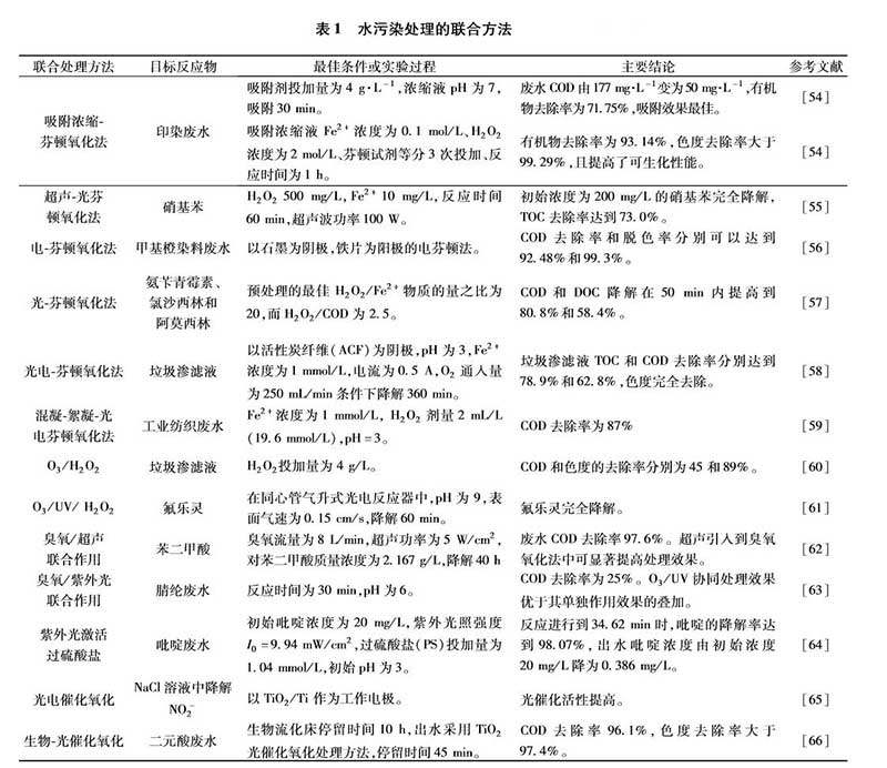 高級(jí)氧化技術(shù)(AOPs)高效、使用范圍廣、處理效果優(yōu)異,但其基礎(chǔ)理論還不十分完善,且實(shí)際污染系統(tǒng)復(fù)雜多樣,存在處理成本高、反應(yīng)條件苛刻、反應(yīng)器復(fù)雜等問題。將高級(jí)氧化技術(shù)復(fù)合使用或與其他技術(shù)相結(jié)合,可發(fā)揮其協(xié)同作用,強(qiáng)化污染物處理效果。
