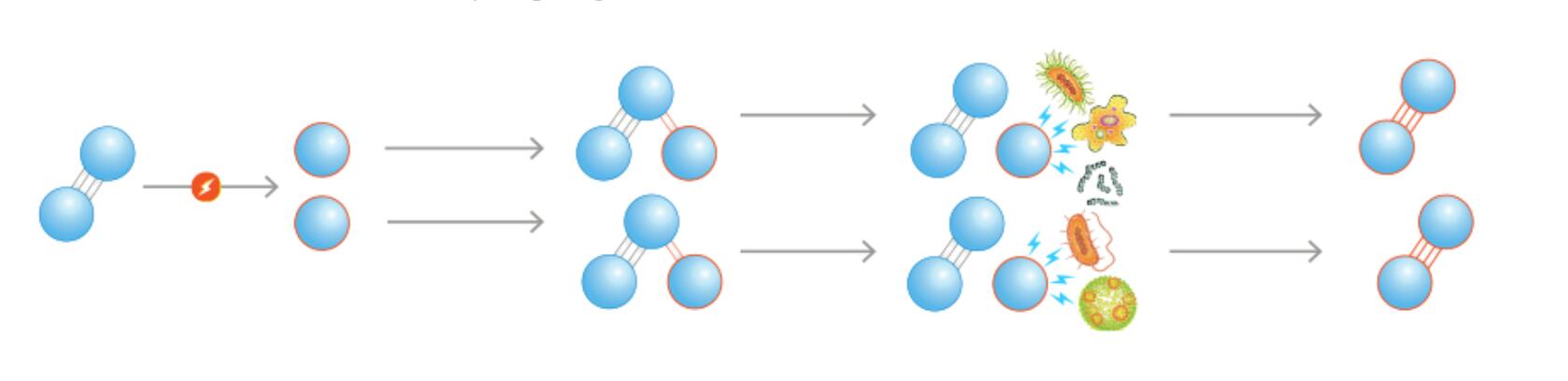 當臭氧分子與可氧化物質碰撞時發生氧化反應,例如藻類,細菌,汗液,尿液,霉菌孢子和原生動物,然后導致弱結合的第三氧原子分裂。在該反應過程中,有機分子被破壞,溶解的金屬變得不溶。剩下的副產品是O 2,這可以減少氯消耗量60-90%。臭氧是一種比氯強得多的氧化劑,能夠殺死耐氯的隱孢子蟲(Cryptosporidium parvum)。它是一種抗菌氧化劑,是一種消毒劑和消毒劑,可有效去除生物膜。臭氧也是一種令人印象深刻的微絮凝劑。它在氧化過程中將有機和無機污染物聚集在一起,因此它們更容易被過濾器除去。