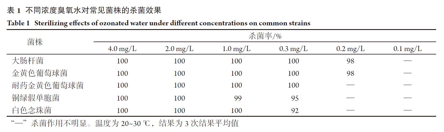 在常溫(25 ℃)常壓下,新制臭氧水作用1 min對(duì)標(biāo)準(zhǔn)菌株大腸桿菌(8099 ) 、金黃色葡萄球菌(ATCC6538)、耐藥金黃色葡萄球菌、銅綠假單胞菌菌(9201)、白色念珠菌(ATCC10231)的殺滅率可達(dá)100%;濃度為1.0 mg/L臭氧水作用1 min對(duì)銅綠假單胞菌的殺滅率為99%,對(duì)其他常見(jiàn)菌的殺滅率為100%。濃度為0.3 mg/L臭氧水作用1 min對(duì)大腸桿菌、金黃色葡萄球菌、耐藥金黃色葡萄球菌、銅綠假單胞菌及白色念珠菌的殺滅率分別為100%,100%,100%,95%和92%。濃度為0.2 mg/L臭氧水作用1 min對(duì)大腸桿菌、金黃色葡萄球菌的殺滅率均為98%(表1)。