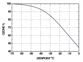 該圖表顯示了.隨著露點(水分含量)增加,臭氧發生器出現輸出減少的情況。左軸