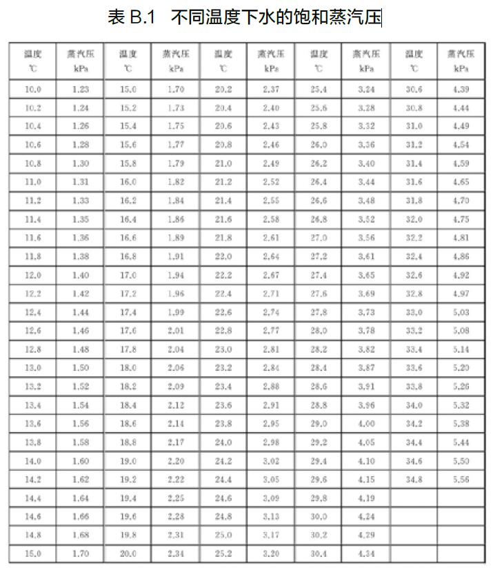 p v —— 飽和水蒸氣壓,單位為千帕(kPa),跟濕式流量計的溫度有關(guān),參見表B.1;